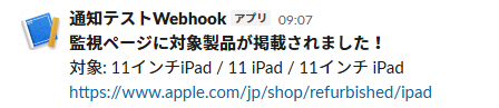 そこで、入荷待ちしている品名を指定し、その製品がアップされたら(製品名のリンクが存在したら)slackに通知を飛ばすことで、無事に欲しかったものを購入できました。